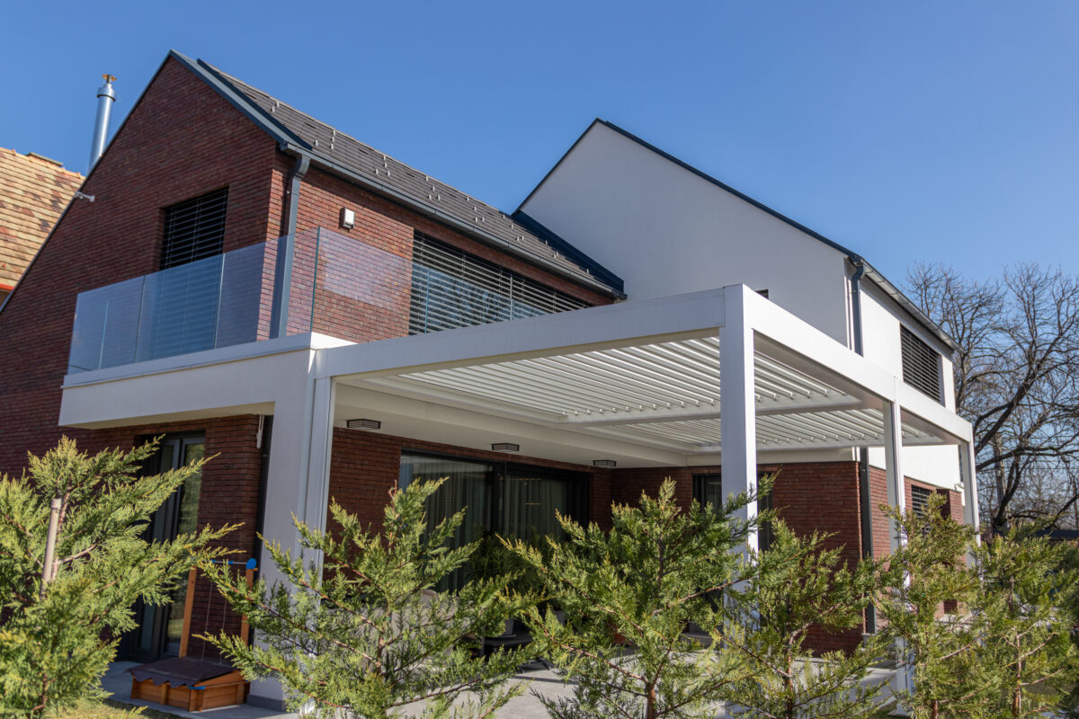 Az első verzió szerint az erkélylemez alá került volna a pergola, azonban ez a megoldás nem bizonyult megfelelőnek: túl sötét volt, így összenyomta a teret, ahelyett, hogy egy tágas pihenősarkot nyújtott volna. Mivel mi nem elégszünk meg egy előnytelen megoldással, azt tanácsoltuk, hogy helyezzük feljebb az árnyékolót, elérjük a kívánt wow hatást és teraszélményt. Péter elfogadta a javaslatunkat, és egy elegáns, barna színű Hella pergolát választott otthona ékeként. Az egyeztetések és árajánlat elfogadását követően megbeszéltek szerint pedig el is kezdődött a pergola gyártása.