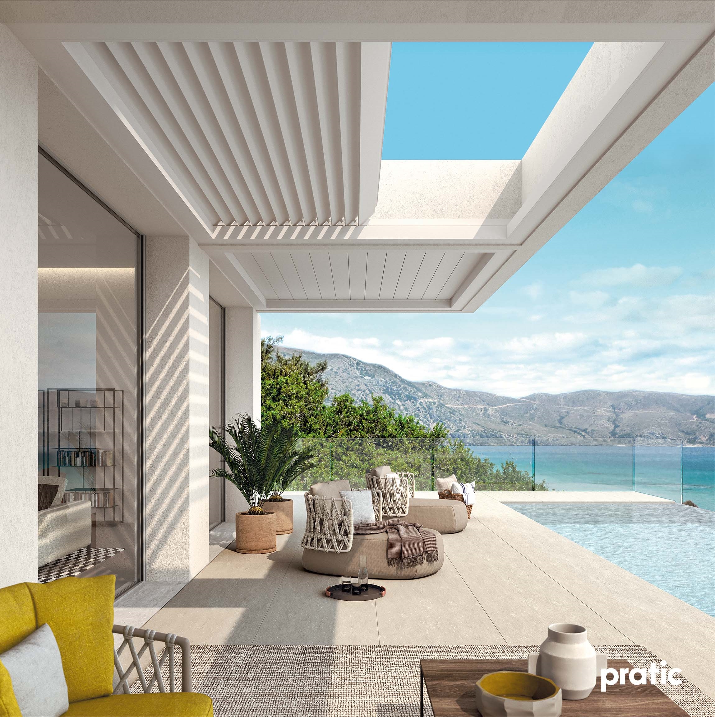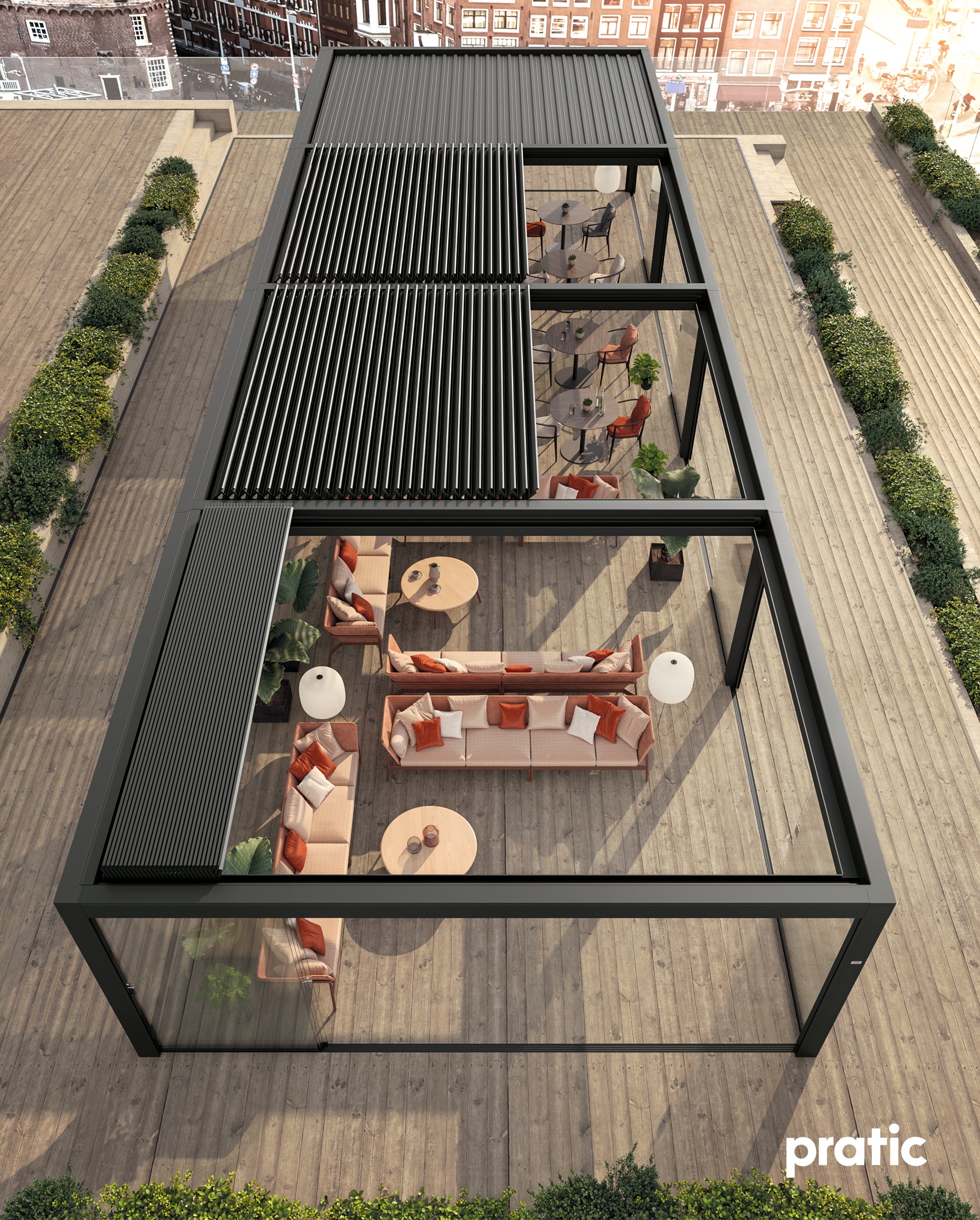 „A Brera sorozat úgy lett megtervezve, hogy egyszerű és funkcionális módon reagáljon a kertek és szabad terek iránti vágyra, és a legnagyobb szabadságot kínálja, két előny kombinálásával: időjárás elleni védelem és a teljes nyitás lehetősége. Egyetlen gyors mozdulattal, csendesen és elegánsan, a Brera árnyékoló lamellák behúzhatók, minimális gyűjtési csomagot képezve.”