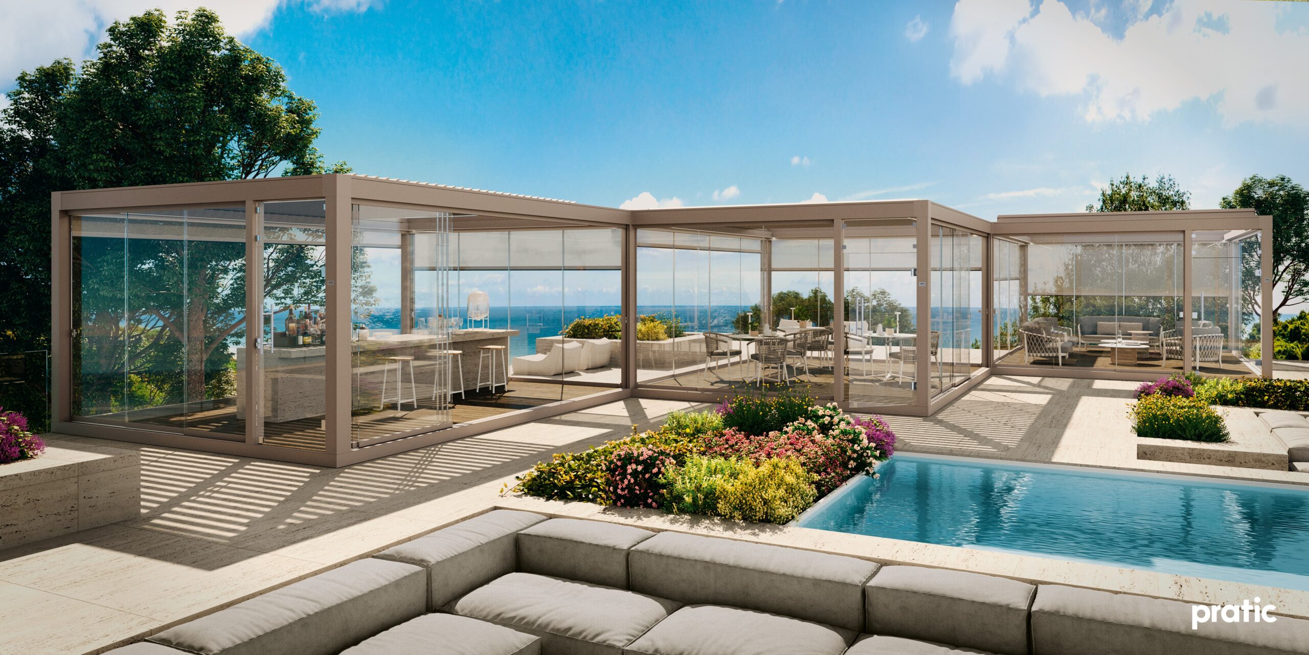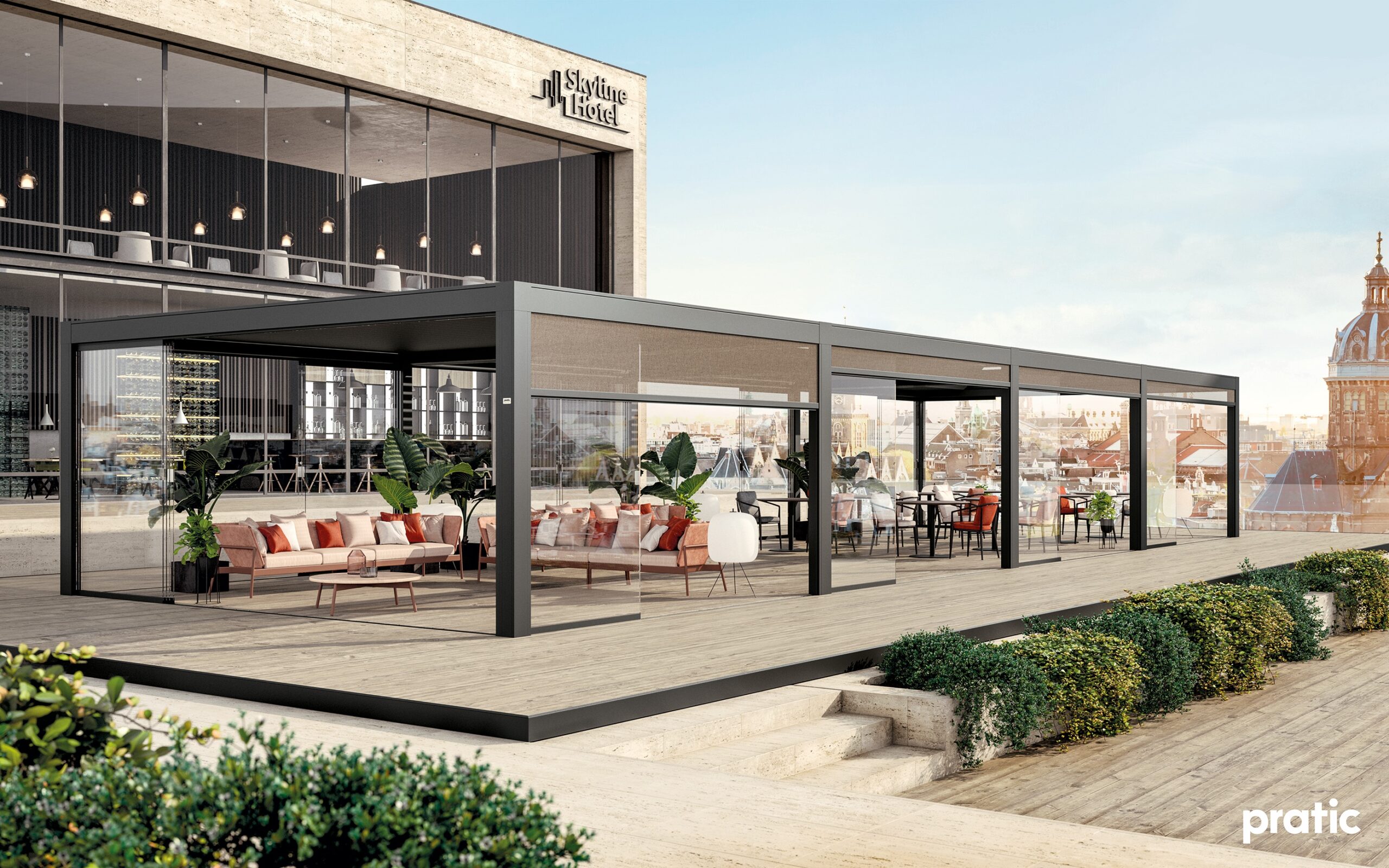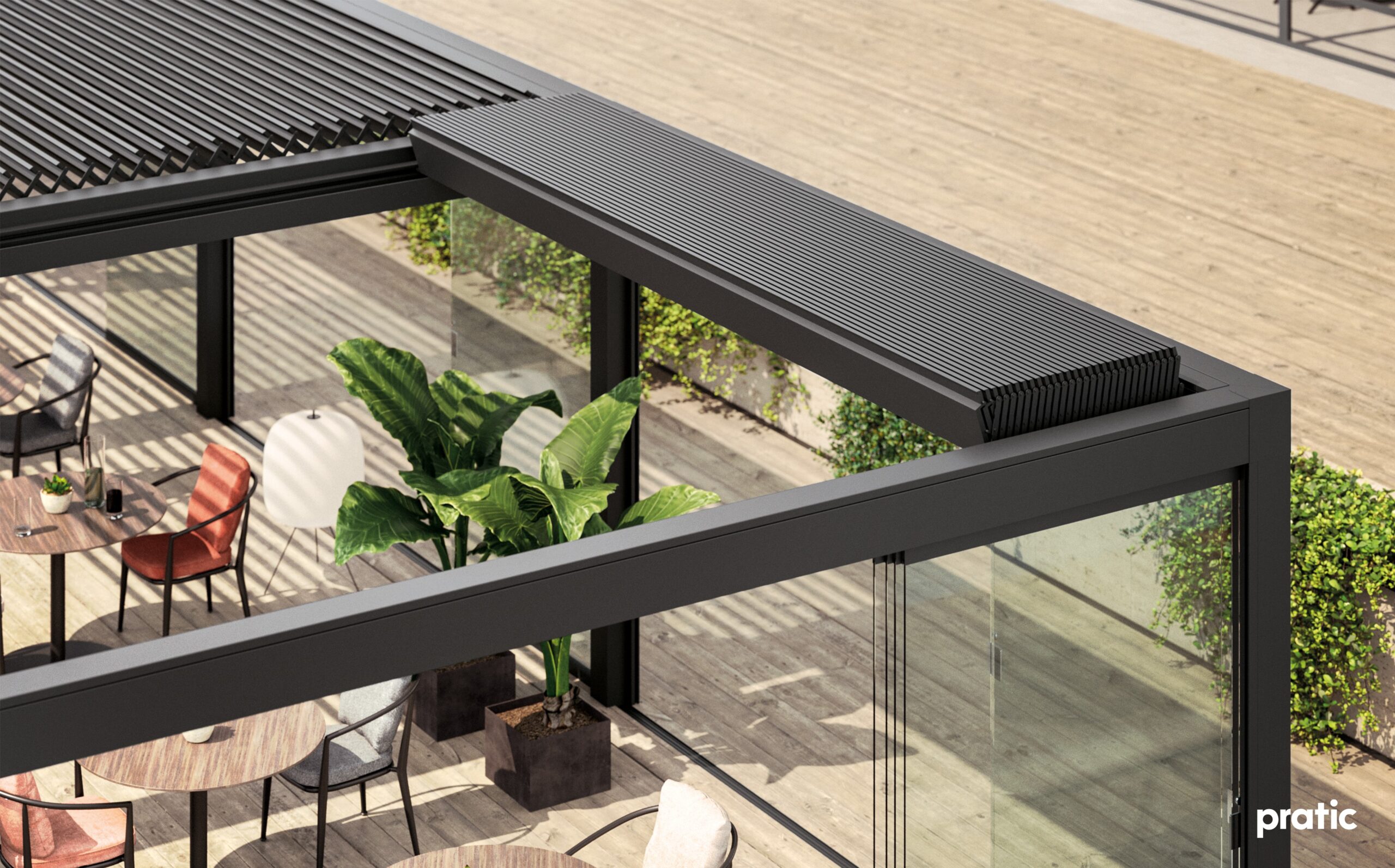 egy megoldás, amely lehetővé teszi a szabad tér maximális kihasználását, miközben biztosítja a védelmet legyen szó akár napról, vagy esőről, vagy kíváncsi tekintetekről. A síneken mozgatható, edzett üveg panelek tükrözött, szatinált vagy füstszínű kivitelben is elérhetők.”