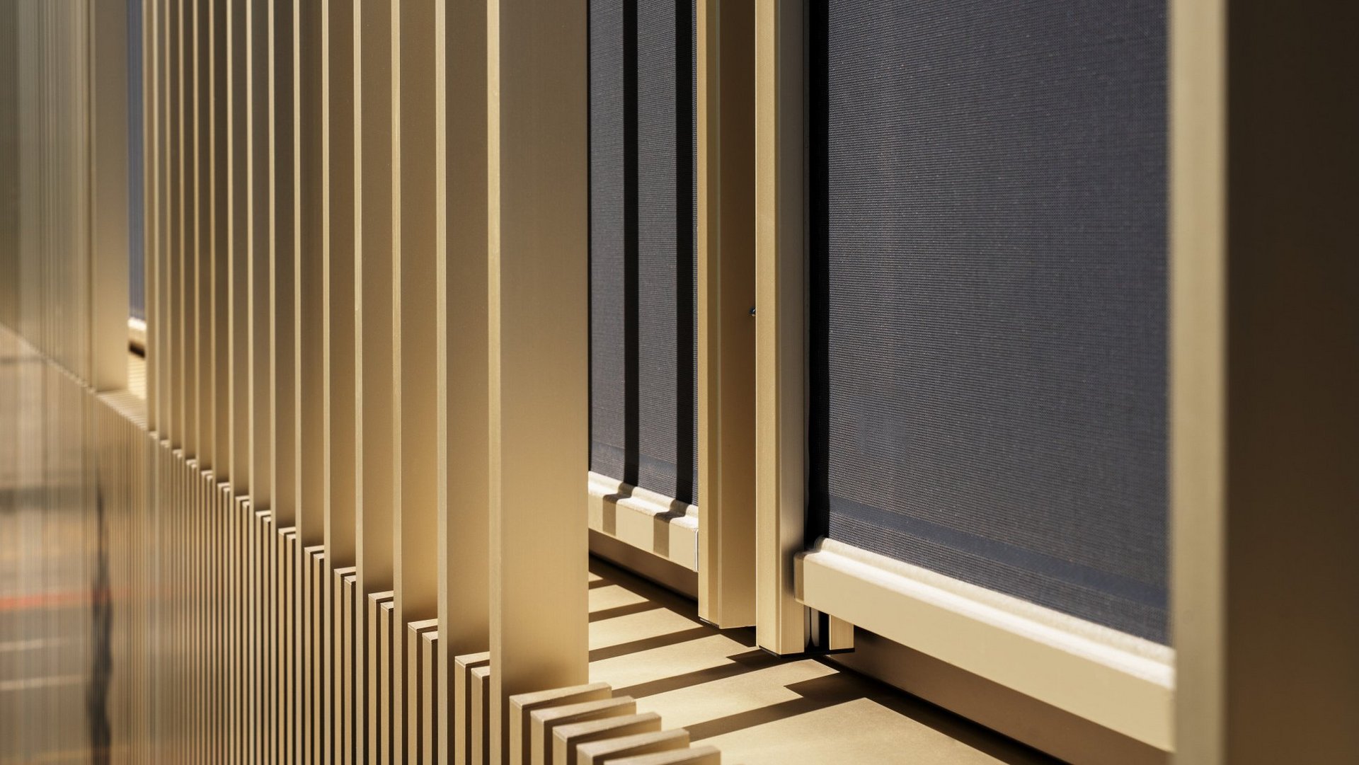 Schenker által gyártott ZIP rendszerű, un. szélálló homlokzati vászonárnyékolók