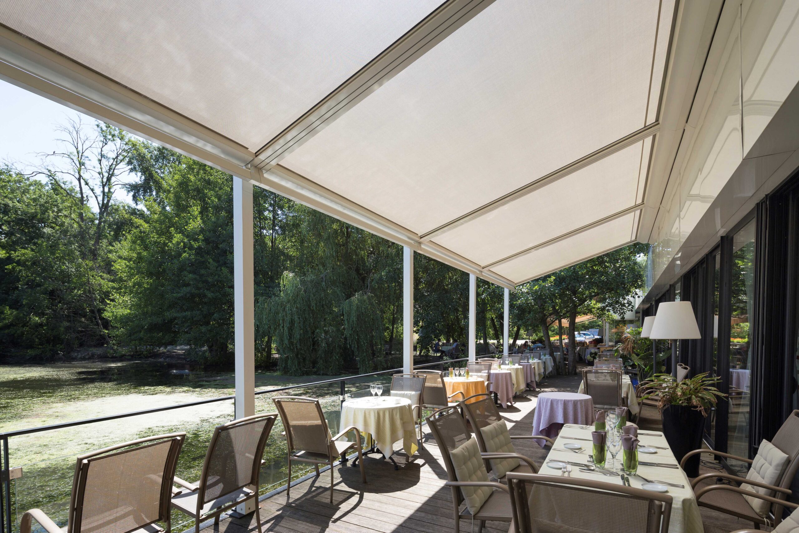 Teraszfedés szél- és vízálló vászonnal, un.Fixscreen kivitelben. Függőleges kiegészítő árnyékoló rendelhető hozzá.