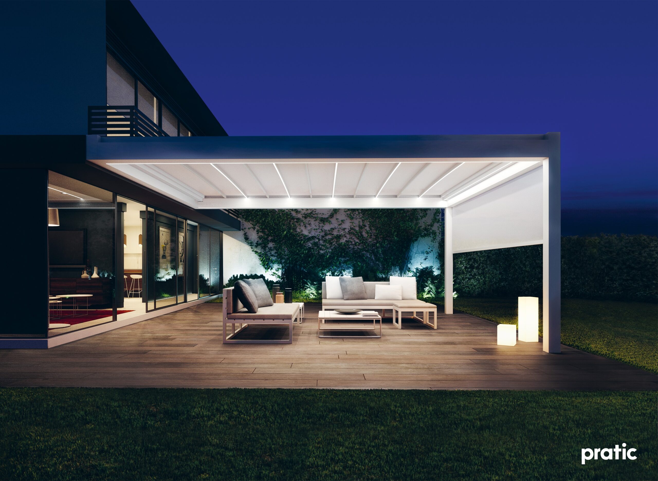 A vászon keresztirányú tartóin elhelyezett LED Line változtatható fényerőt és színeket biztosít, hogy egyedi hangulatot és fényjátékokat teremtsen a szabadban.