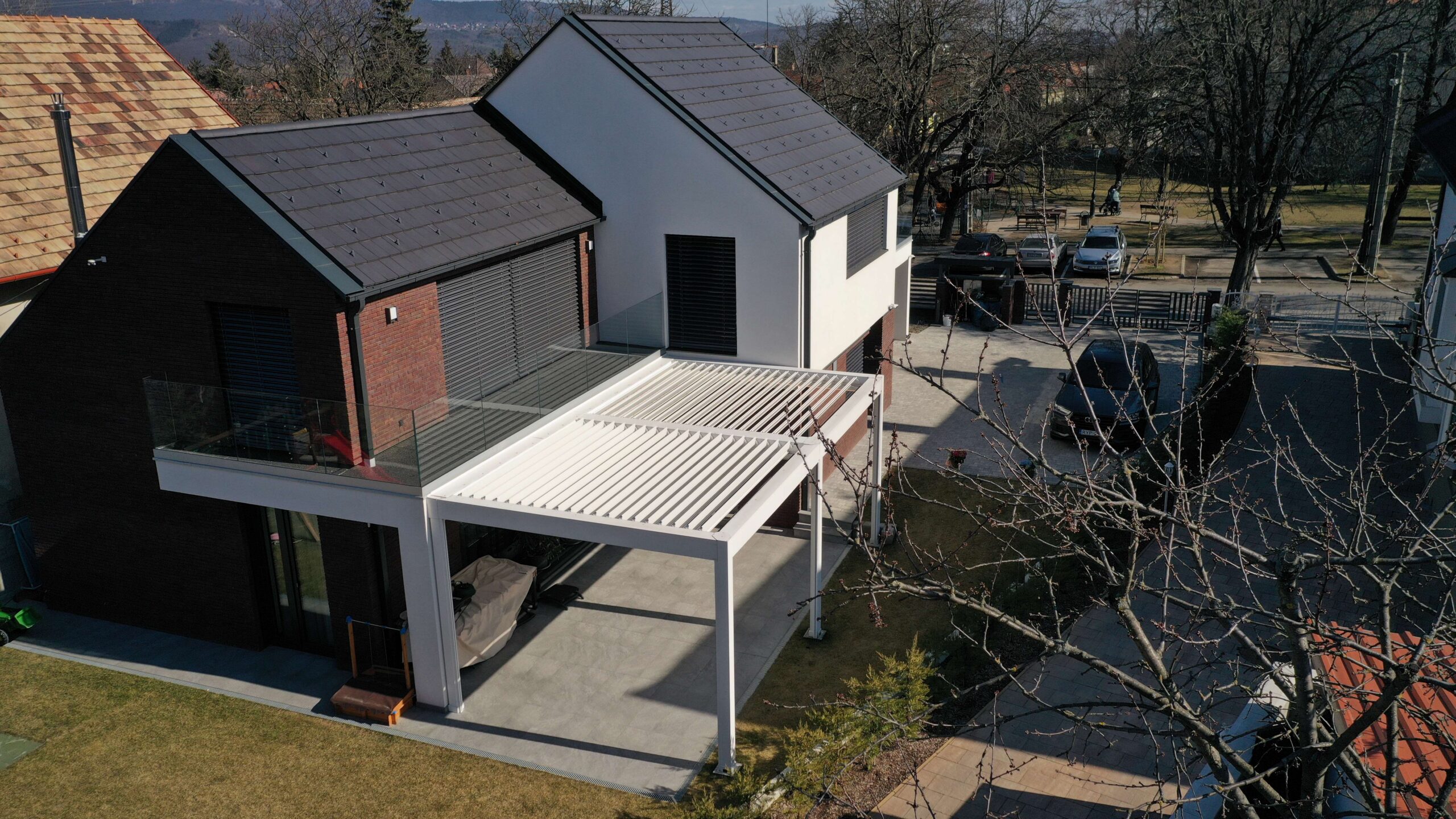 A pergola-napellenző vezetősínnel és keskeny oszlopokkal ellátott a stabil és szélálló működés érdekében. A pergola-napellenző mindig falra szerelhető tartókonzolokkal érkezik, így fali felületre van szükség a felszereléshez. A oldalsó vezetősínnek köszönhetően a napellenző mélysége hosszabb lehet, mint a szélessége, így akár keskeny és mély teraszok is árnyékolhatók.